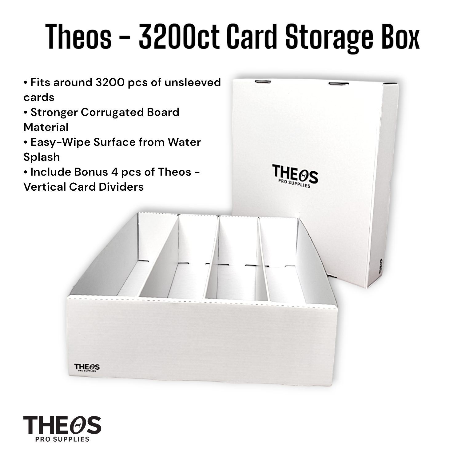Conquer your bulk collection with the Theos 3200CT V2! This massive 4-row storage box holds 3200+ cards and features a unique water-resistant finish for superior protection. Made from stronger, stackable corrugated material, it’s the ultimate solution for organizing your TCG and sports cards.